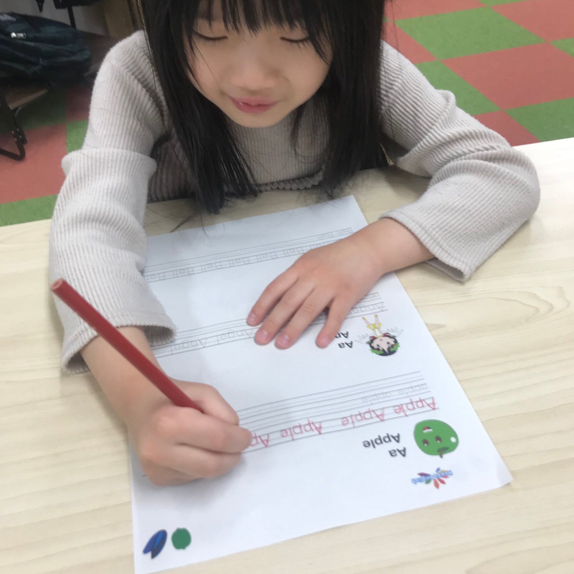 先生の英語での問いや呼びかけに反応できるようにしていきます。アルファベットの書き方練習、簡単な単語の聴きとりを身に付け、アクティビティを通して、コミュニケーション力を養っていきます。お絵かきや工作など創造力も伸ばしていきます!