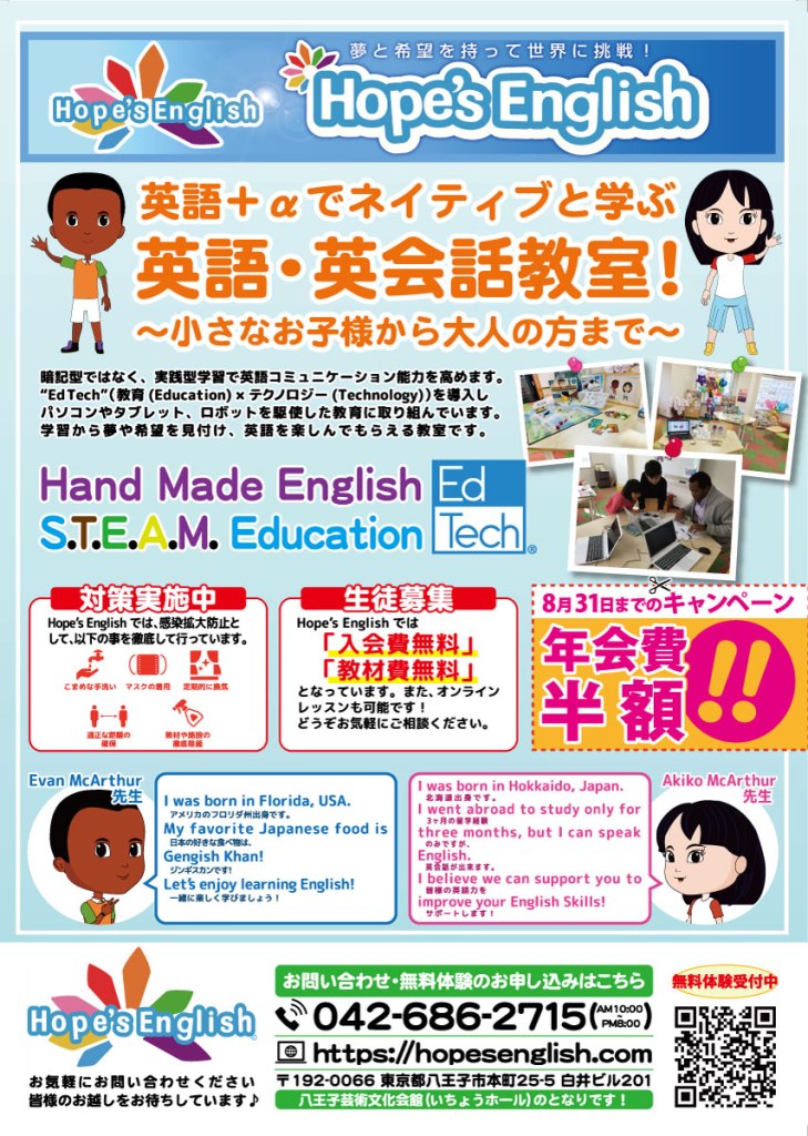 より多くの皆様にとって、Hope’s Englishが成長の場となるよう尽力して参りますので、末永く宜しくお願い申し上げます。